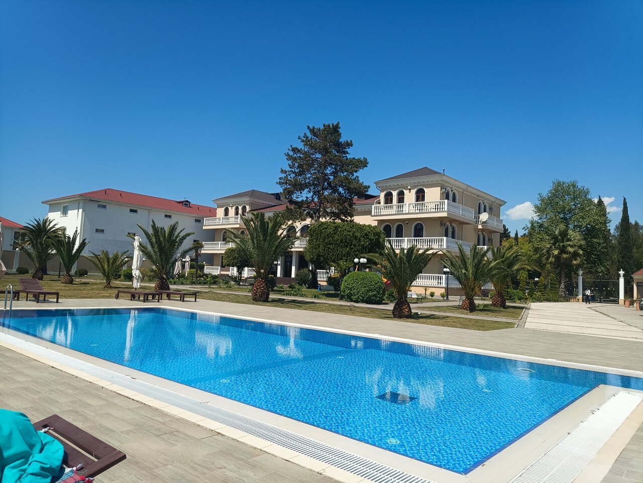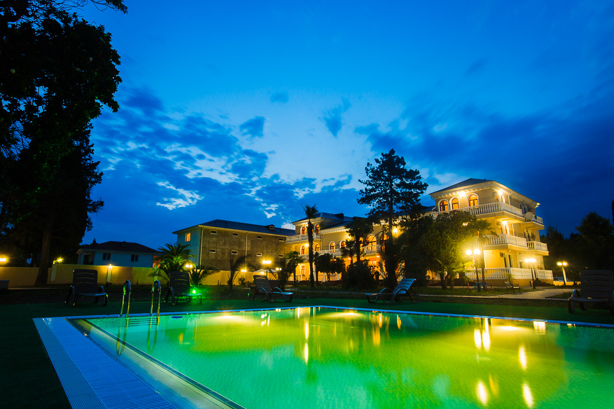 Своей архитектурой трехэтажный отель 2012 года постройки напоминает классические виллы и дворцы вельмож прежних времен. Он расположен на закрытом охраняемом участке среди кипарисов, сосен и пальм. На территории, принадлежащей отелю, есть открытый подогреваемый бассейн с релакс-зоной, уголки для отдыха, зеленые лужайки. В жилом фонде гостиницы – просторные номера разных категорий, от «стандартов» до «апартаментов». Все они оснащены сплит-системами, первоклассной мебелью и качественной сантехникой. В каждом номере есть спутниковое телевидение, а с балконов открывается живописные виды парка, города или моря.
